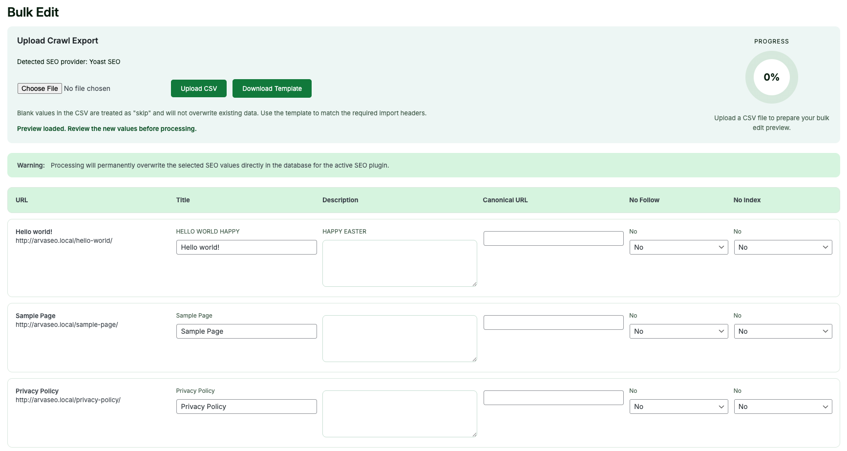 Bulk updates the metadata such as the title, description, canonical url, and the indexing of a page. Created for most Web Developers and SEO Specialists who do website audits. Currently supports Yoast as of the moment.